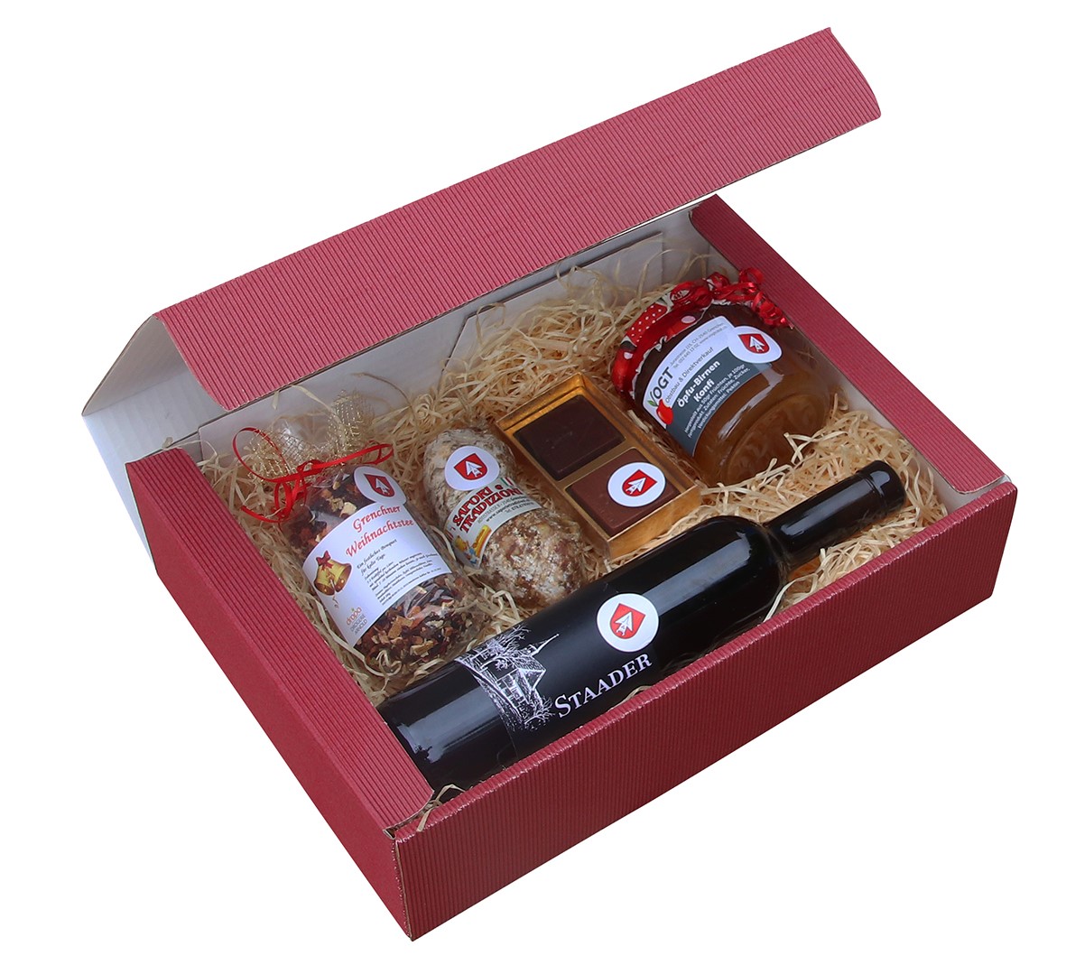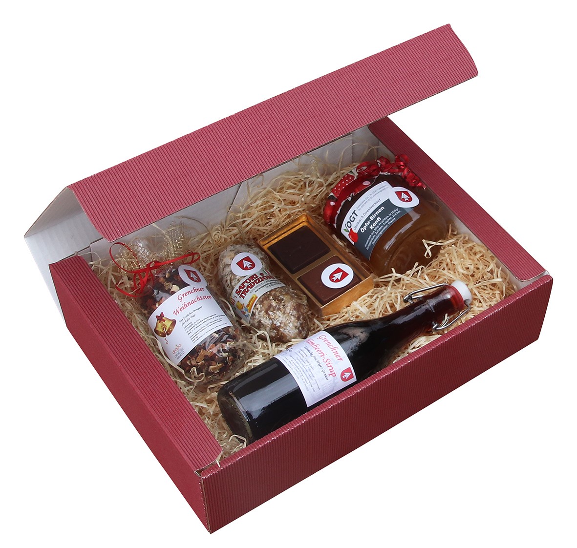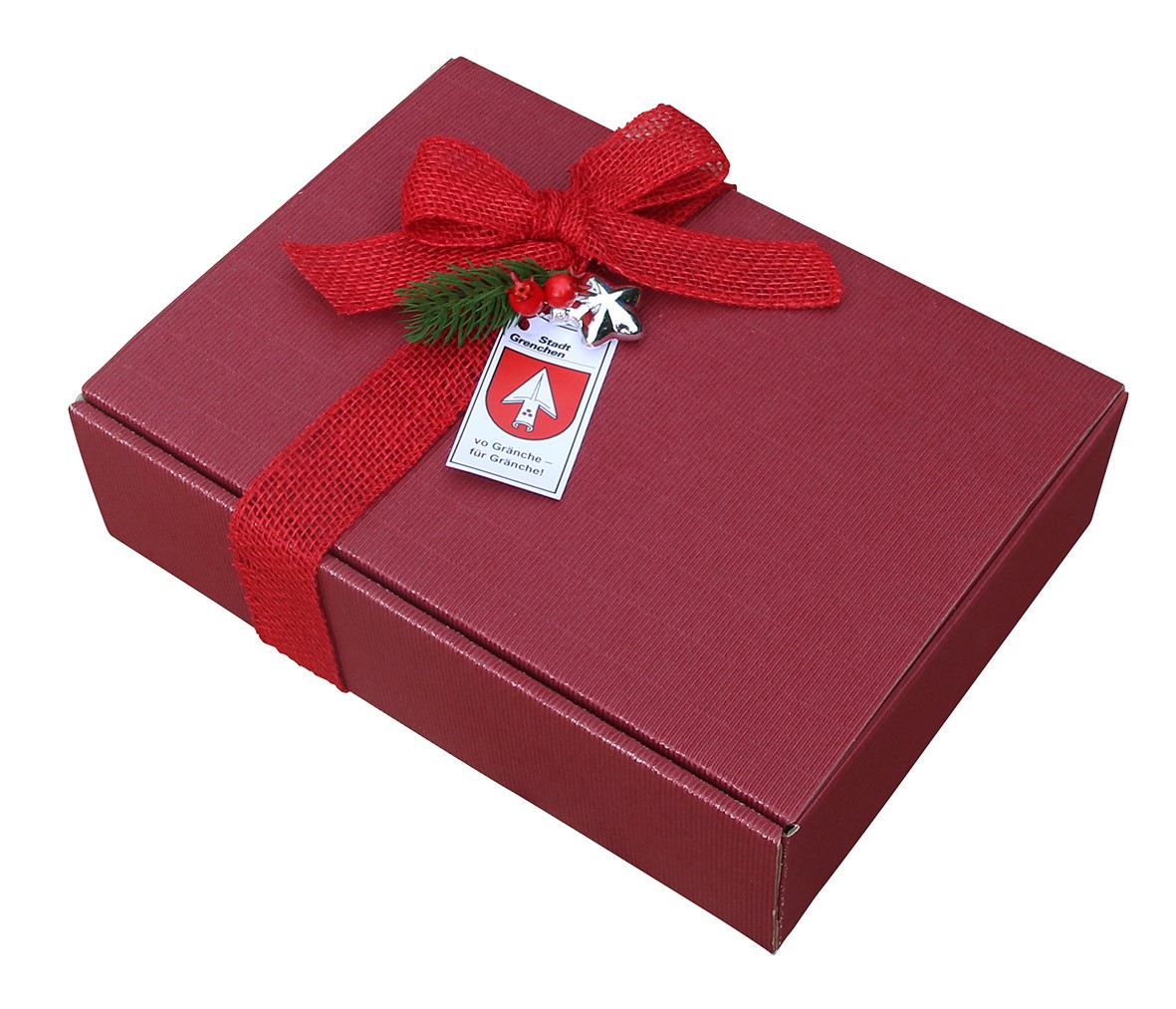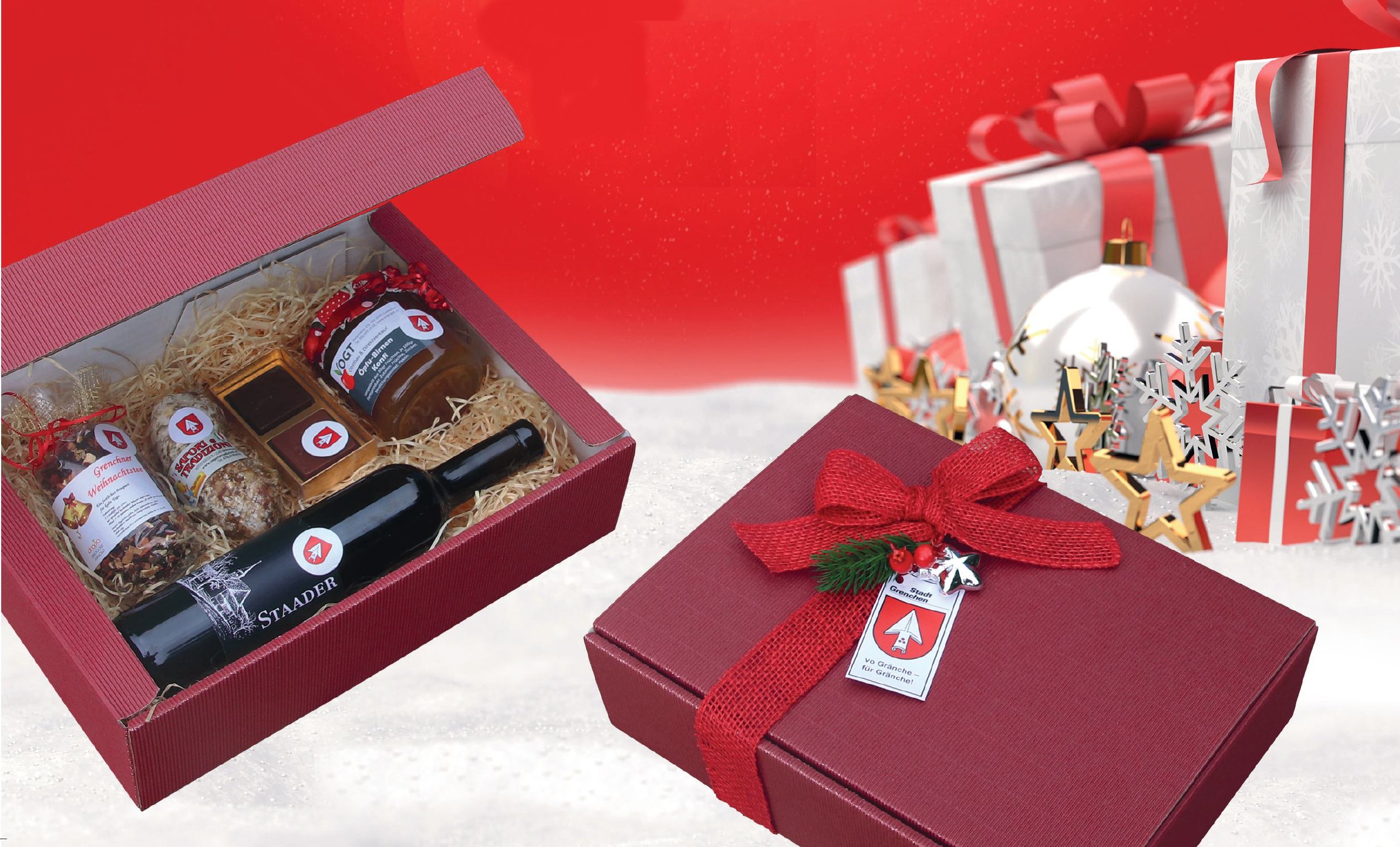 Ein Gränchner Chischtli des Gewerbeverbands ist prall gefüllt mit kulinarischen Spezialitäten aus Grenchen, kommt immer gut an und macht Freude! Das Chischtli enthält eine geschmackvolle Salami, ein Glas Konfitüre, eine süsse Chocolat-Versuchung und eine spezielle Weihnachtstee-Mischung aus der Region. Sie können zwischen der “alkoholischen Variante” ergänzt mit einem erlesenen “Staader” Rotwein oder einer “nicht alkoholischen Variante” mit einem erfrischenden Grenchner Himbeer-Sirup auswählen.